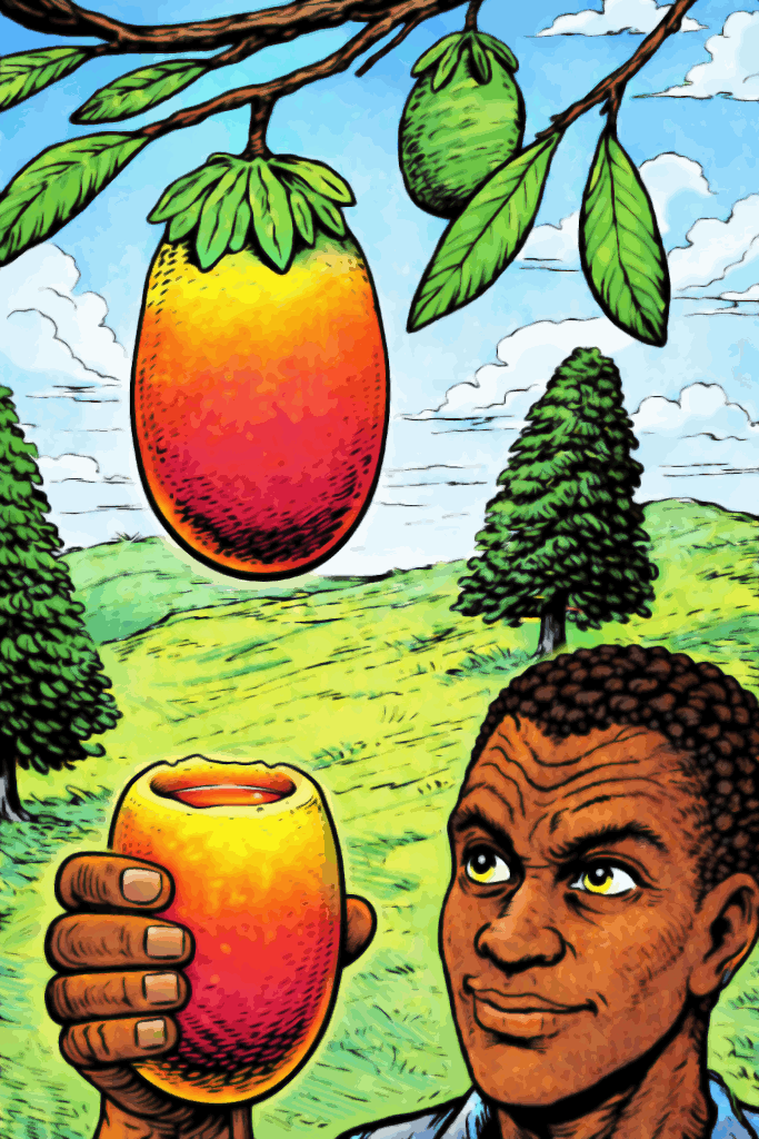 The fruit of the Del-Brikki consists of an inedible hard outer shell that contains a sweet nectar that has an alcoholic content of about 90 proof. This naturally occurring cocktail is an important part of the laid-back tropical culture of most of Dionysus. The fruit naturally takes on rainbow coloration when ripe, and the top of the fruit where the stem attaches easily pops off, opening the fruit for consumption. The main enhancement to the enjoyment of the Del-Brikki was the introduction of refrigeration when the first humans arrived on Dionysus in GSC 155.