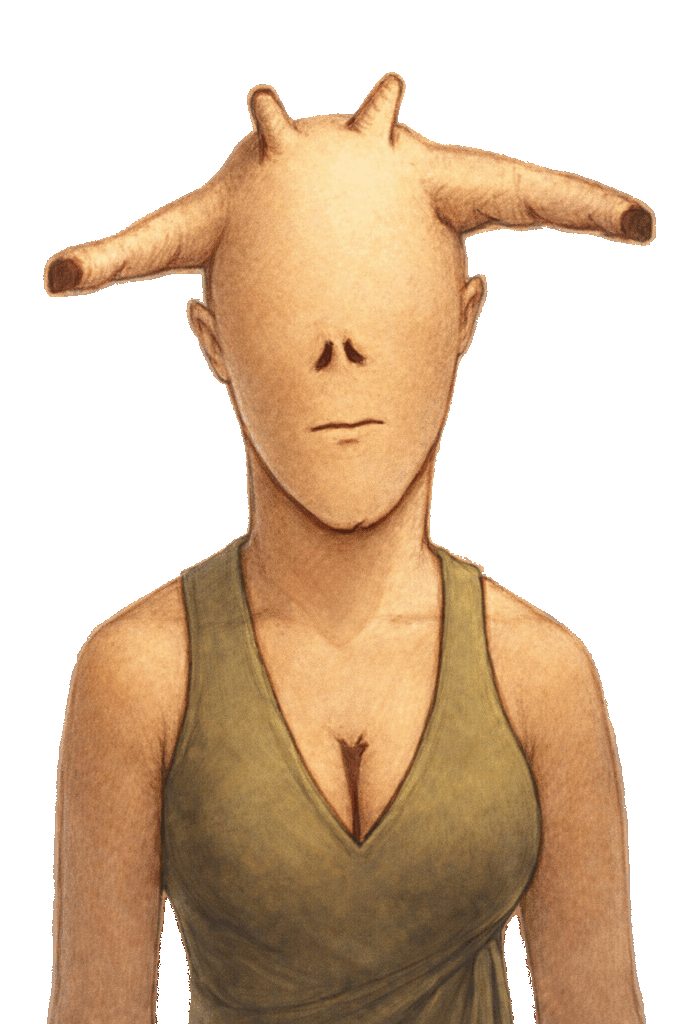Lärkians have their eyes at the end of stalks growing out of the sides of their heads. This gives them the advantage of 360° vision. Females have short horns on their heads while males grow large antlers. Lärkian skin is covered with short, velvety fur, usually brown in color.